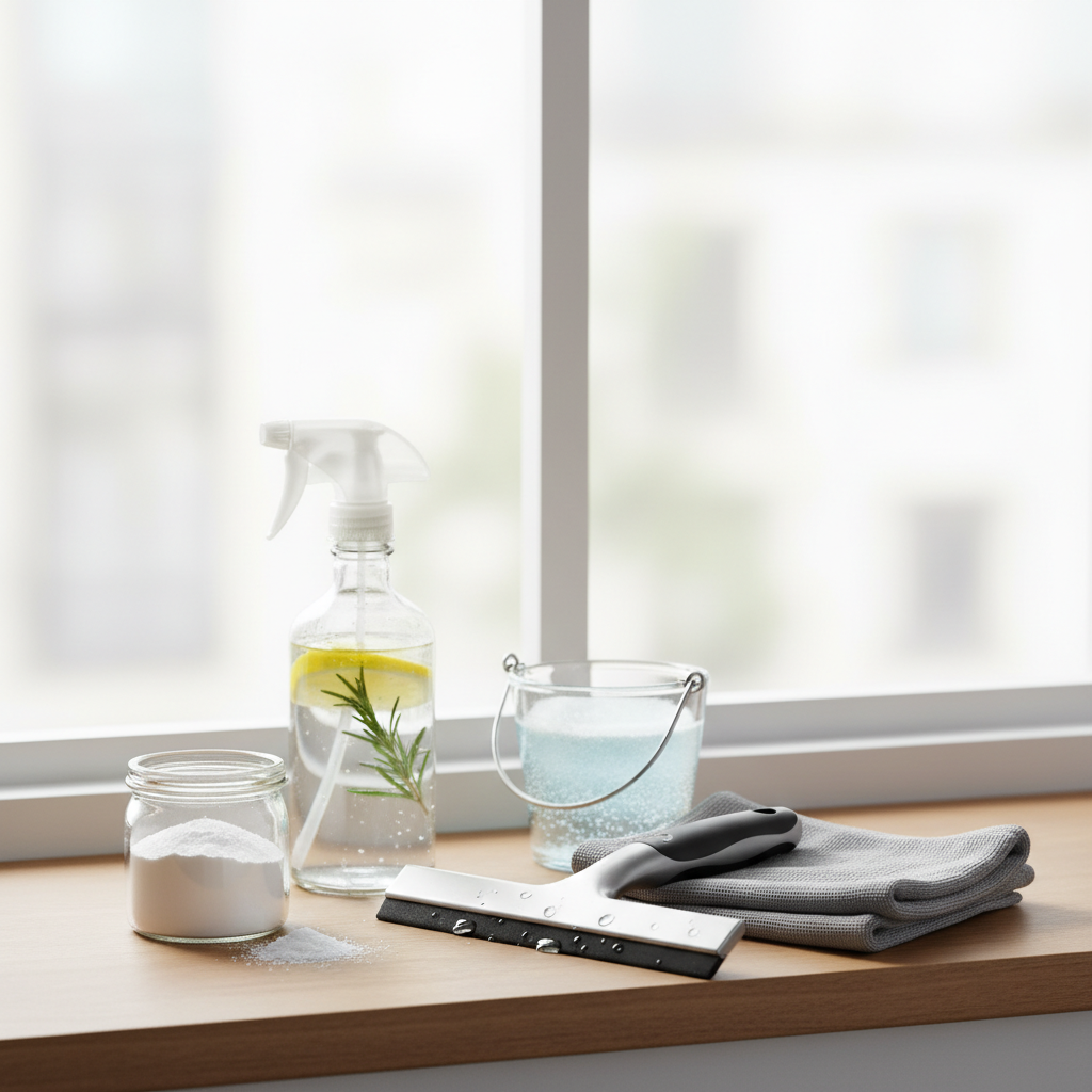 - Langų valiklis: galima naudoti tiek komercinį, tiek natūralų – pavyzdžiui, actą su vandeniu. Acto tirpalas veiksmingai pašalina riebalus ir nepalieka dryžių.