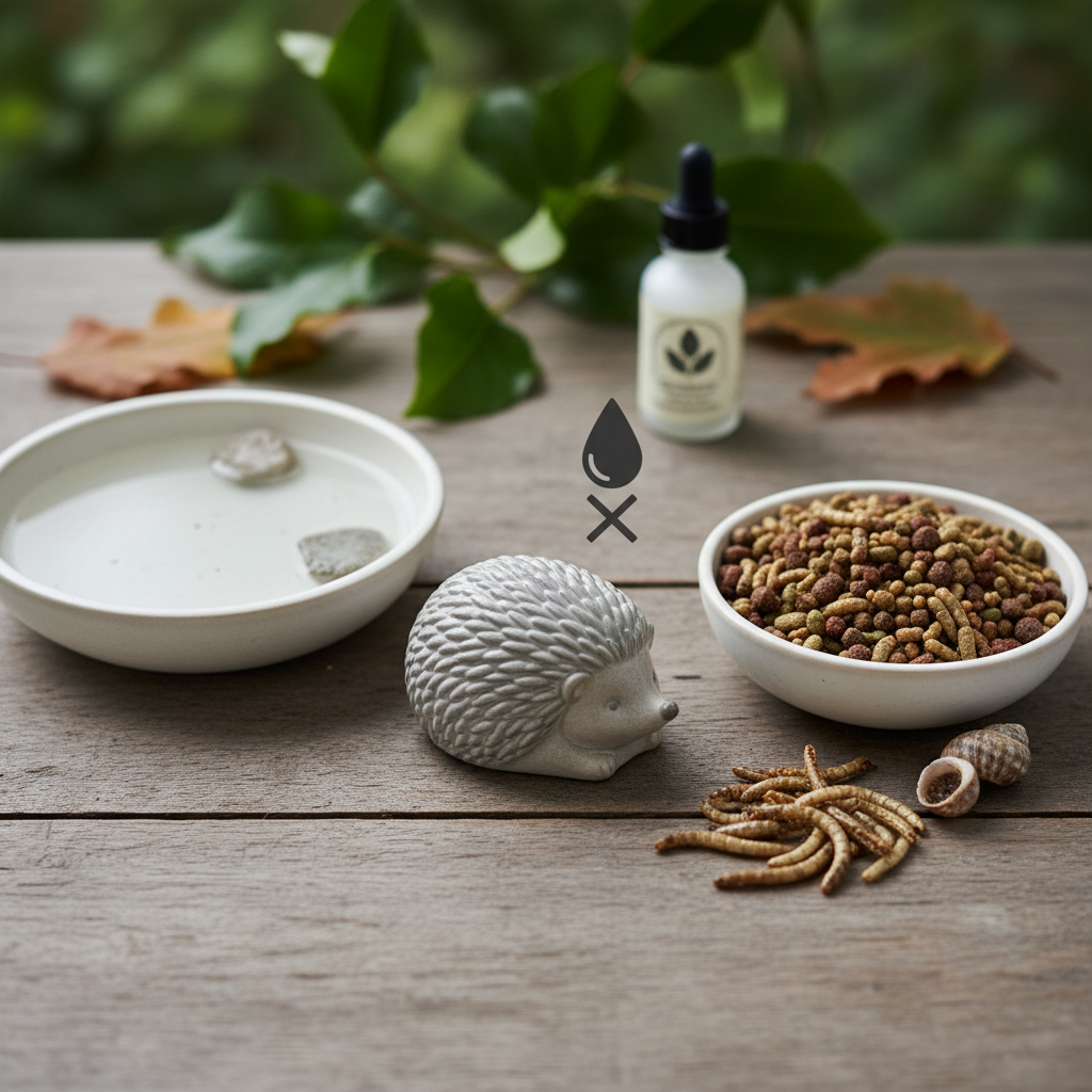 - Švarus, šviežias vanduo: Tai yra pats svarbiausias dalykas, kurį galite padaryti ežių labui. Platus, seklus dubenėlis su šviežiu vandeniu yra tiesiog gyvybiškai būtinas, ypatingai alinant vasaros karščiams. Dubenėlis neturėtų būti per gilus, kad ežiui nereikėtų smarkiai persisverti geriant, o netyčia slystelėjęs ir įlipęs į vidų, jis galėtų nesunkiai išlipti atgal ant žemės.