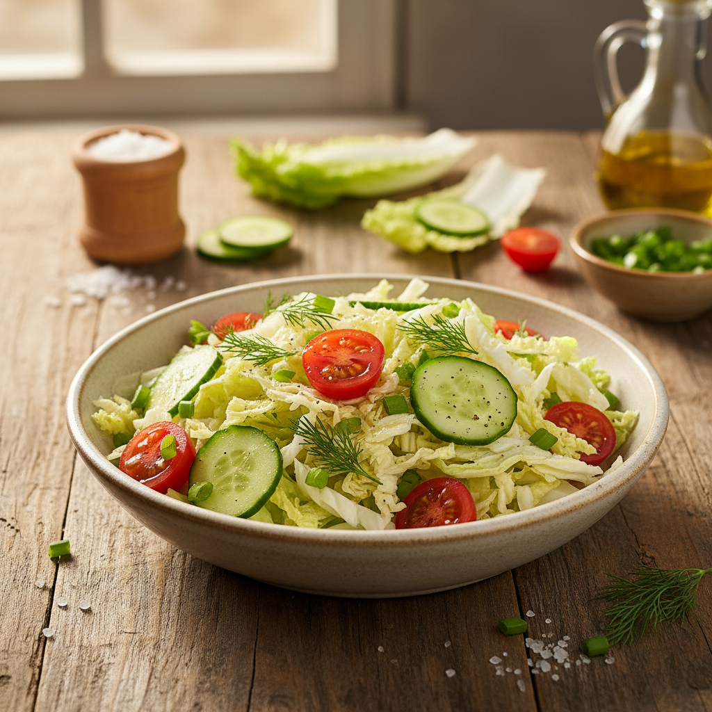 - Paprastos pekino kopūstų salotos su kefyro ir krapų padažu – tradicinis, lietuviškam skoniui artimas variantas.