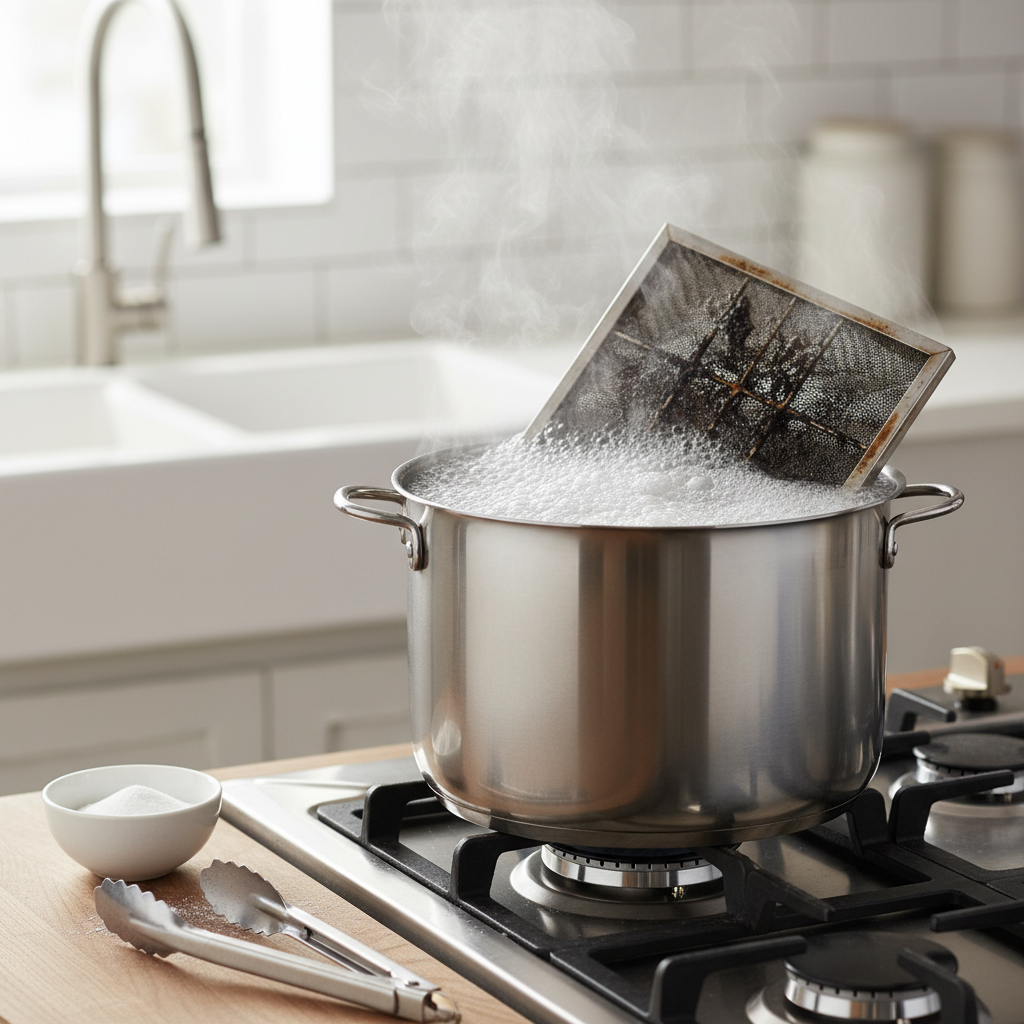 - Filtro panardinimas: Naudodami virtuvines žnyples, atsargiai įleiskite riebaluotą gartraukio filtrą į verdantį sodos ir vandens tirpalą. Jei filtras netelpa visas, panardinkite vieną jo pusę. Jau po kelių sekundžių pamatysite, kaip į paviršių pradeda kilti riebalų lašeliai ir nešvarumai. Leiskite filtrui pavirti apie 3-5 minutes.
