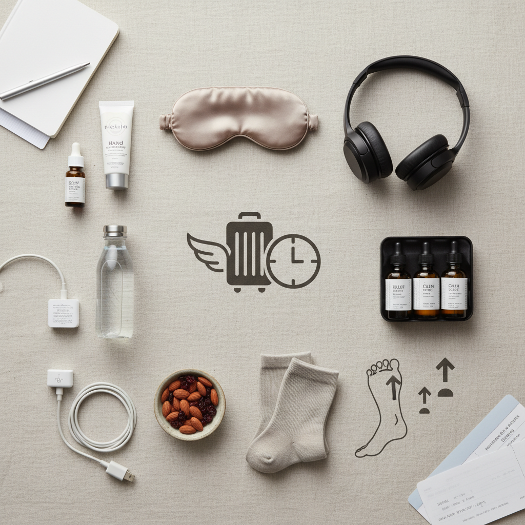- Kompaktišką, ergonomišką kaklo pagalvėlę, kokybiškus ausų kištukus ir šviesos nepraleidžiančią šilkinę miego kaukę.
