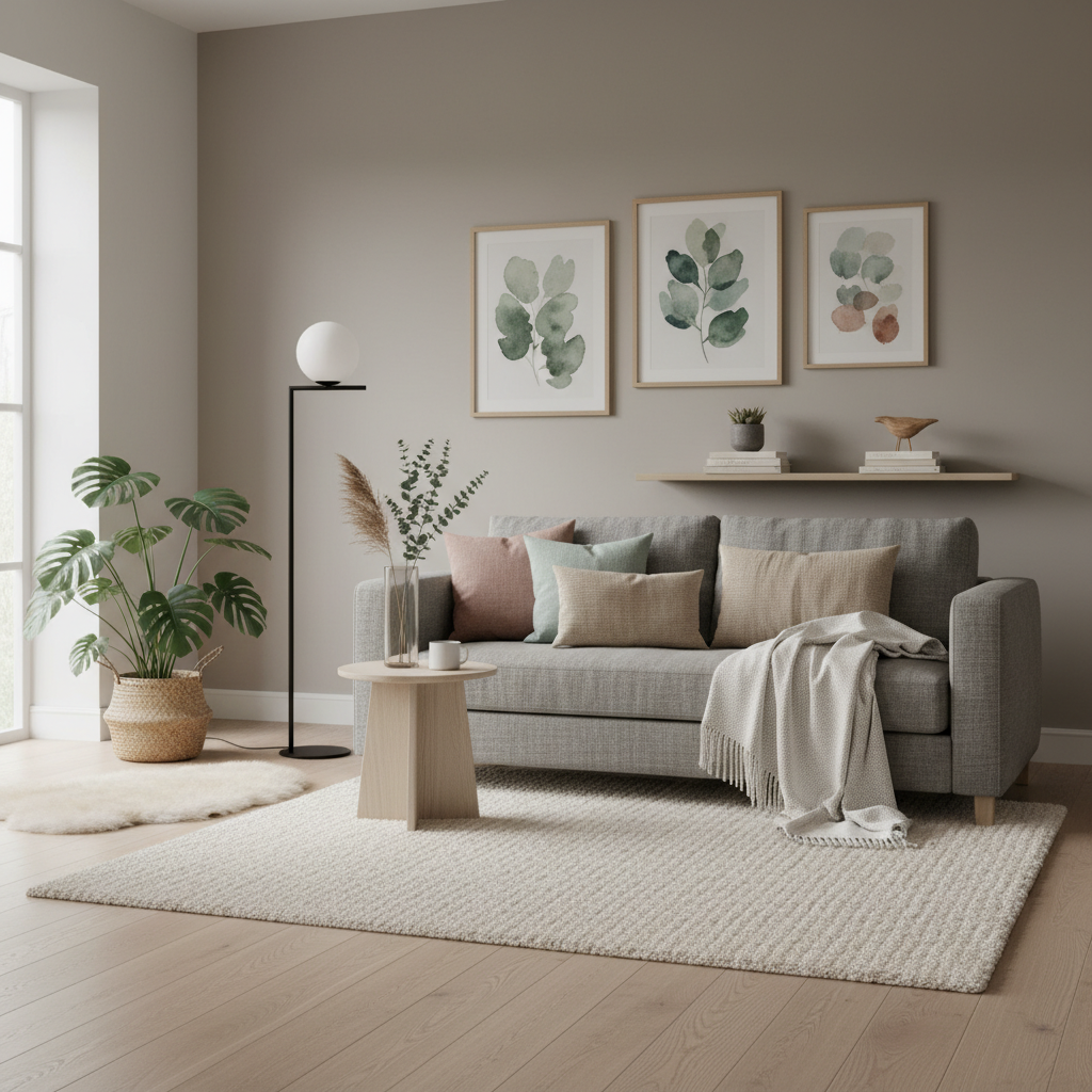 Pilka jau daugiau nei dešimtmetį dominuoja moderniuose interjeruose, tačiau mažoms svetainėms tinka tik patys šviesiausi jos variantai. Šalta šviesiai pilka spalva turi savybę „atsitraukti“, todėl sienos vizualiai nutolsta. Dar populiaresnis dizainerių pasirinkimas – vadinamasis „greige“ atspalvis. Tai tobulas pilkos ir smėlinės (rusvos) spalvų mišinys. Jis apjungia pilkos eleganciją ir smėlinės šilumą. „Greige“ atspalviai yra neįtikėtinai universalūs: jie keičia savo charakterį priklausomai nuo paros laiko ir apšvietimo, tačiau visada išlaiko atvirumo ir erdvės pojūtį.