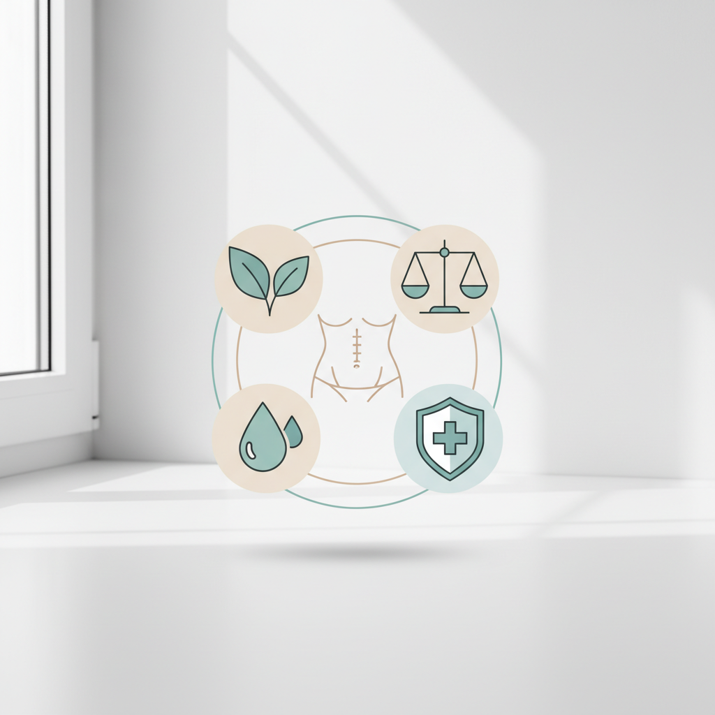 - Privaloma dėvėti kompresinį korsetą: Jis mažina patinimą, padeda audiniams prigyti ir palaiko pilvo sieną.