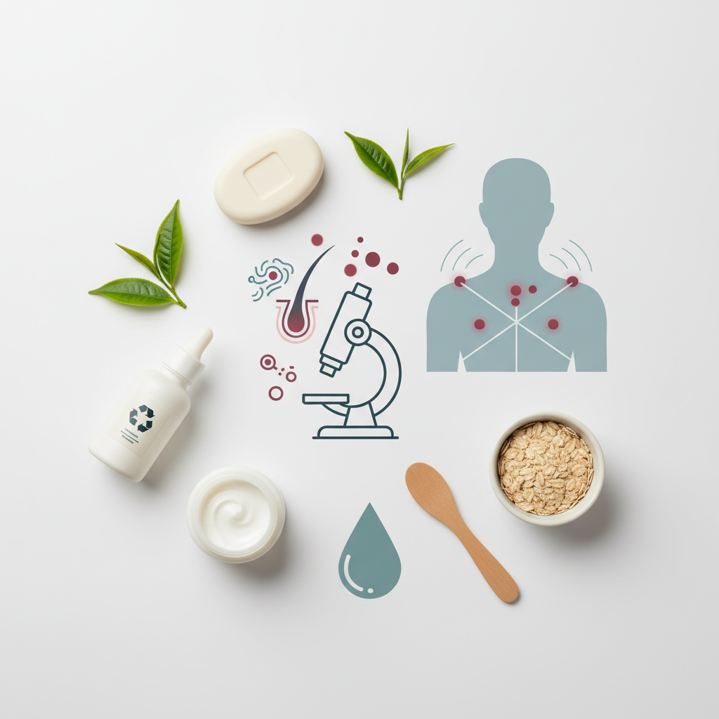 - Plaukų priežiūros priemonės: Kondicionieriai, kaukės ir aliejai, skirti plaukams, dažnai nuteka ant nugaros prausiantis duše. Šiuose produktuose esantys ingredientai (pvz., silikonai, tiršti aliejai) gali būti komedogeniški – t.y., kemšantys kūno odos poras.
